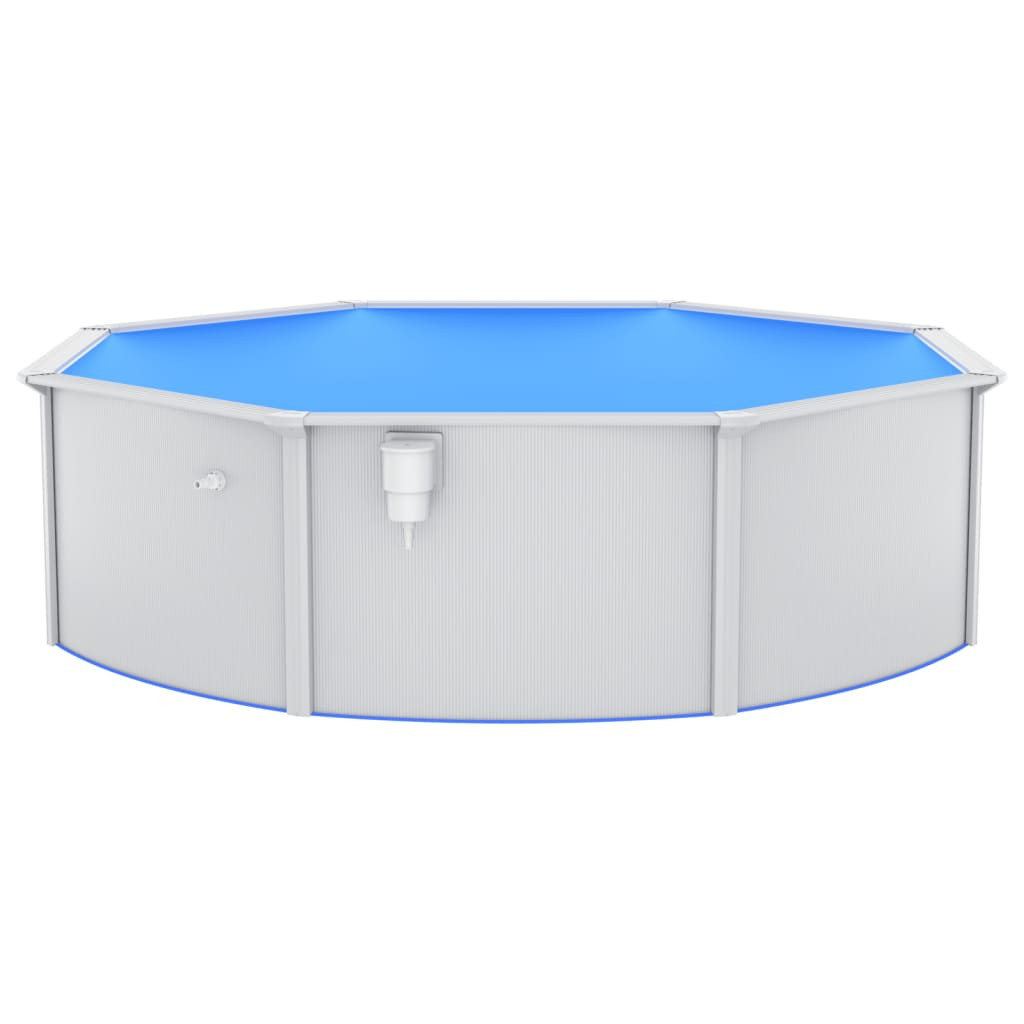 Basen ten posiada wytrzymałe ścianki ze stali i jest obity wytrzymałym, zimowym materiałem PVC, co gwarantuje jego odporność i trwałość. Jego rozłożenie jest szybkie i proste. Dołączony skimmer ułatwia skuteczne usuwanie zanieczyszczeń. Drabinka z 4 stopniami zapewnia wygodne i bezpieczne wejście i wyjście z basenu. Filtr piaskowy oczyszcza 11000 litrów na godzinę i posiada trwały, odporny na korozję zbiornik do chlorowanej wody o kwaśnym pH. Zawiera on również wielofunkcyjny zawór do łatwego sterowania oraz czytelny manometr ciśnienia. Konstrukcja zacisku kołnierzowego na górze umożliwia obrót o 360 stopni dla łatwej instalacji. W zestawie znajduje się solidna podstawa do stabilnego przymocowania. Pompa filtracyjna pasuje do większości basenów stojących z wlotem o średnicy 2,5 cm.