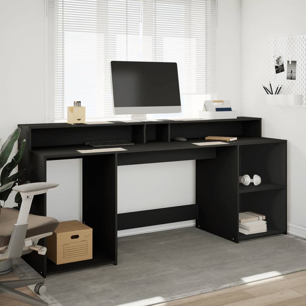 Dzięki dużej przestrzeni do przechowywania, trwałej konstrukcji i oświetleniu LED, biurko doskonale nadaje się do stworzenia zorganizowanego i stylowego miejsca do pracy lub gry na komputerze. Stabilny i trwały materiał: materiał drewnopochodny jest wytrzymały i stabilny oraz charakteryzuje się gładką powierzchnią oferującą odporność na wilgoć, wypaczanie się i rozwarstwianie, dzięki czemu stanowi znakomity wybór do różnych projektów.Oświetlenie LED RGB tworzące przyjemną atmosferę: szafka ma podświetlenie LED, które można łatwo dostosować, aby uzyskać odpowiedni efekt świetlny. Możesz wybrać tryb, kolory i jasność, aby poprawić atmosferę w pomieszczeniu.Sporo miejsca do przechowywania: biurko ma otwarte komory i półki, dzięki czemu oferuje dużo miejsca do przechowywania wszelkich akce