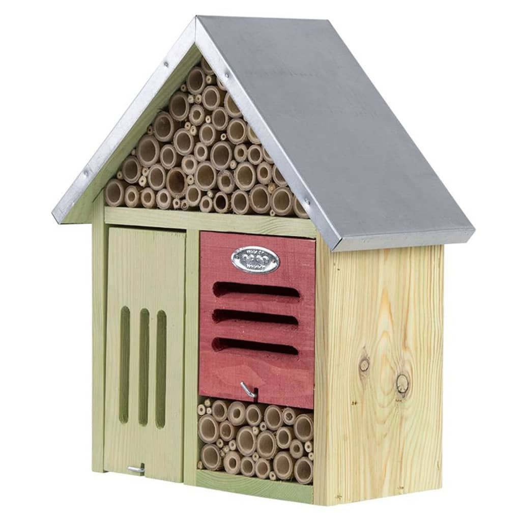 Budka dla owadów została wykonana z naturalnego drewna świerkowego, bambusa i cynku, tworząc doskonałe schronienie dla pszczoł, motyli oraz biedronek. Dolna czerwona przegroda zapewnia ochronę i kryjówkę dla złocistych owadów oraz biedronek. Wspierając zapylanie roślin i funkcjonowanie jako naturalne obrońce przed szkodnikami, owady odgrywają istotną rolę w ekosystemie. Dzięki hotelowi dla owadów, stwarzasz im możliwość budowy gniazd i bezpiecznego zimowania, dostosowując się do różnych wymagań dotyczących średnicy otworu gniazdowego.