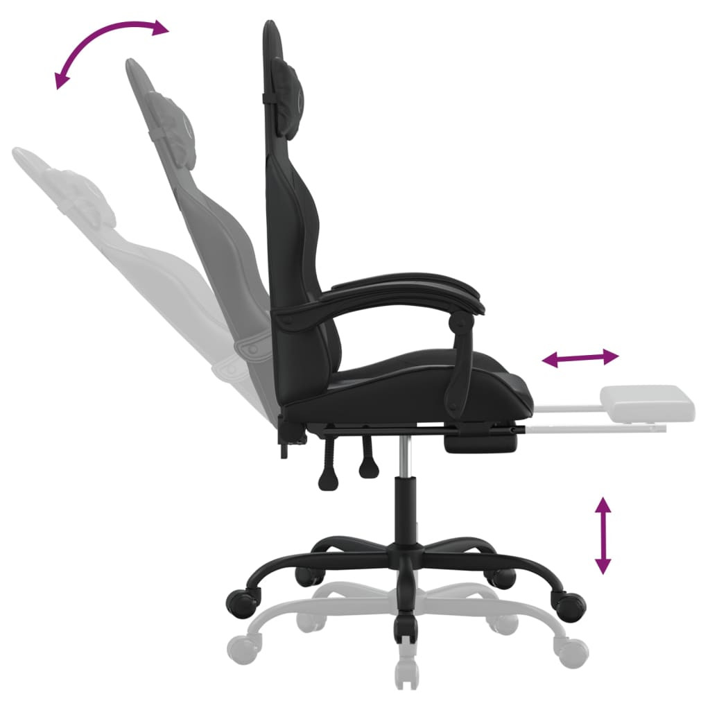 Ciesz się tym unikatowym fotelem gamingowym i graj w wyjątkowo komfortowych warunkach! Trwały materiał: wysokiej jakości, sztuczna skóra jest bardzo wytrzymała. Cechuje się odpornością na plamy, co znacznie ułatwia czyszczenie - wystarczy przetrzeć ją wilgotną ściereczką. Gładka powierzchnia nadaje jej luksusowy wygląd i piękno prawdziwej skóry.Wygodne poduszki i podnóżek: dla Twojej wygody do fotela dołączono dodatkowe poduszki. Pozwalają one wygodnie oprzeć głowę i zrelaksować plecy. Podnóżek zaś zapewnia większy komfort siedzenia.Regulowane oparcie i wysokość: ciesz się maksymalnym komfortem, wybierając optymalną pozycję i kąt nachylenia regulowanego oparcia. Użyj dźwigni, aby ustawić wysokość siedziska zgodnie z własnymi preferencjami.Wygodna konstrukcja: mebel ten obraca się w zak