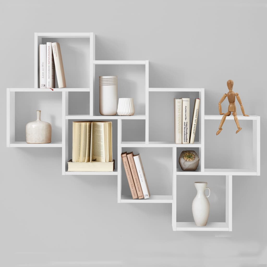 Półka narożna FMD to nowatorskie rozwiązanie do Twojego wnętrza, obejmujące 8 obszernych i 3 mniejsze skrytki ustawione w nietypowy wzór.